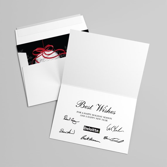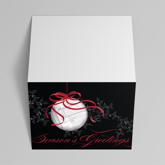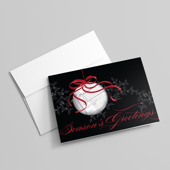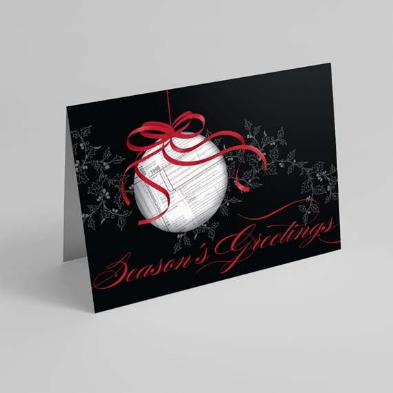 Send a striking holiday greeting with a touch of professional flair. This white, folding greeting with black front and tax form ornament design is the perfect holiday card to represent your business.