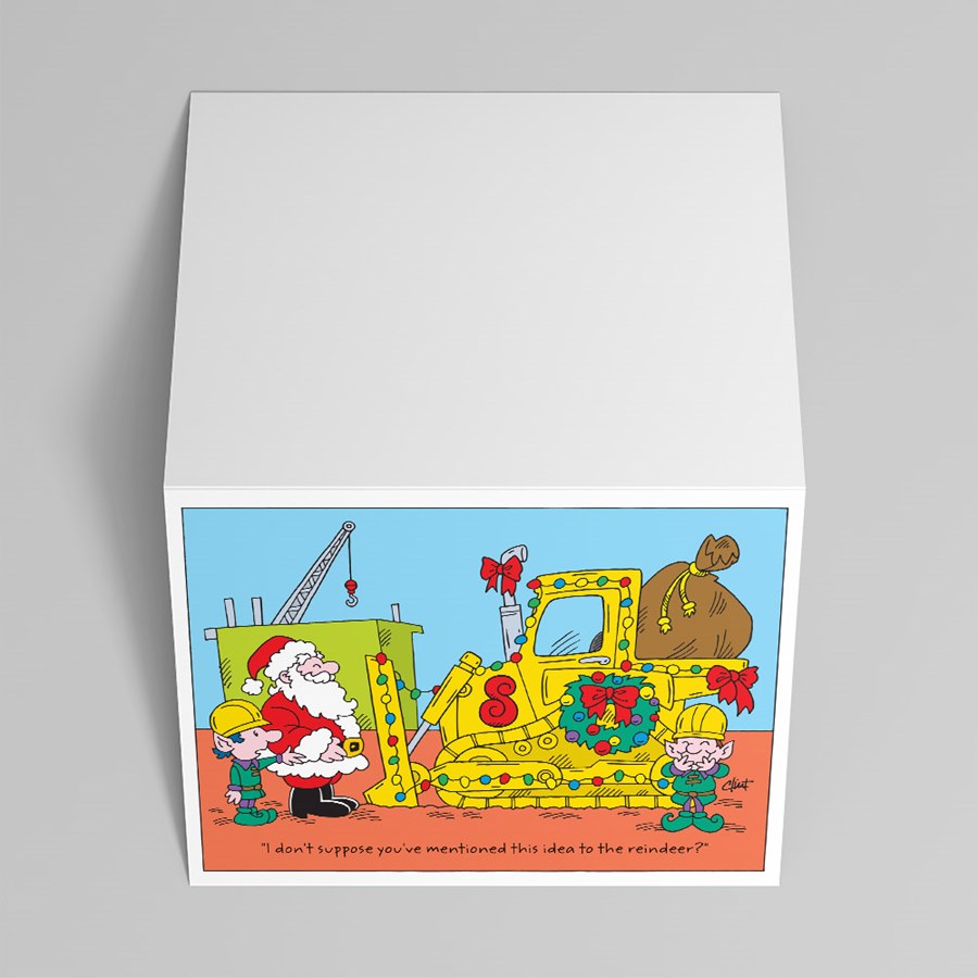 Santa trades in his sleigh for some more power on this humorous holiday greeting card featuring a bulldozer festively decked out for the season.