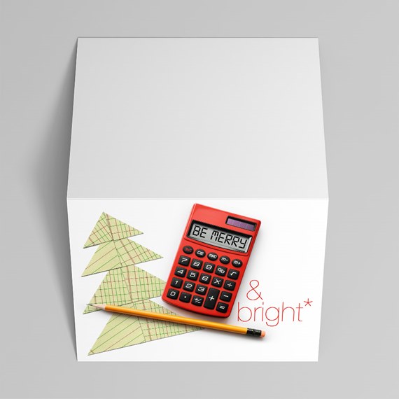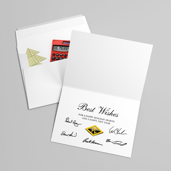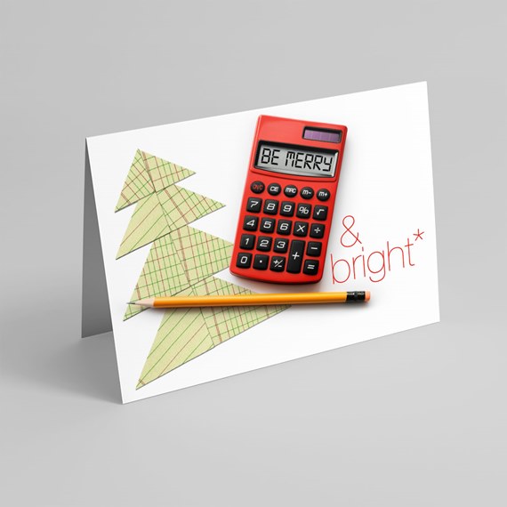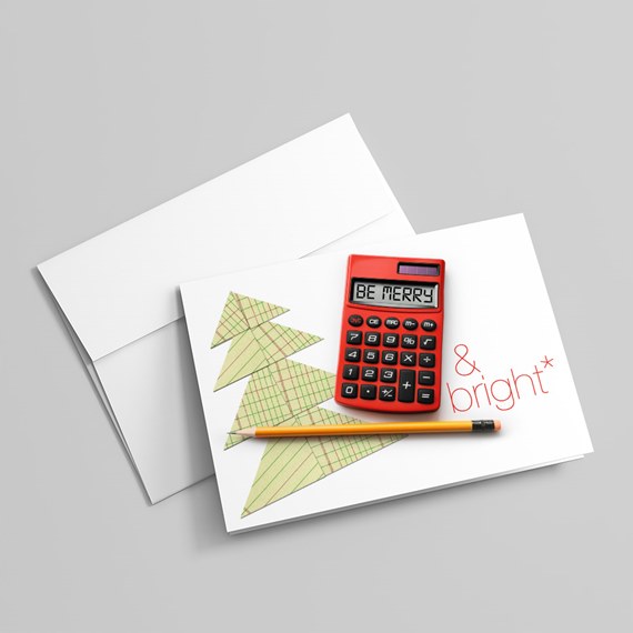 This accounting holiday card will speak to your employees, customers and associates in a fun and lighthearted manner. The calculator and graph-paper Christmas tree create a unique design they'll love.