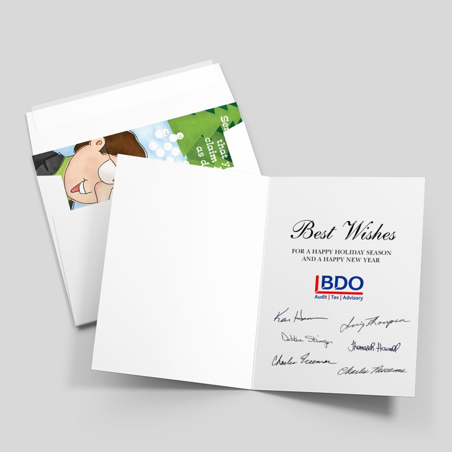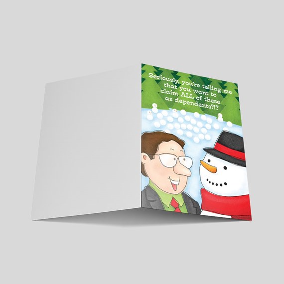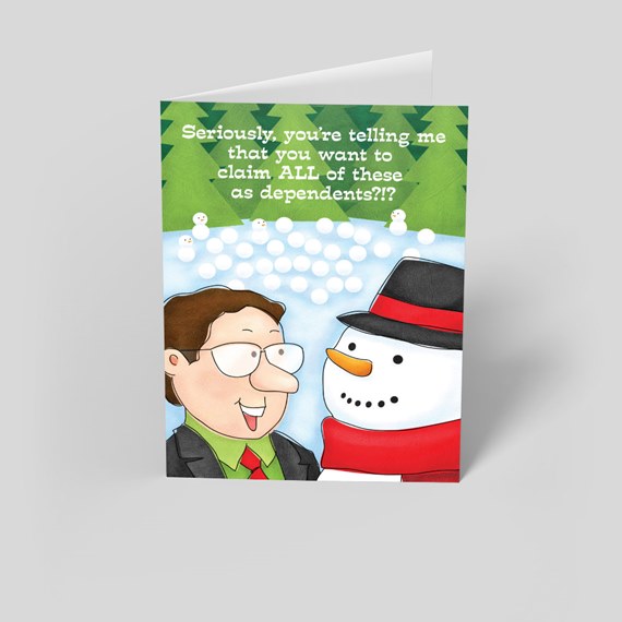 This snowman's accountant needs a little time to accept the unique situation at hand. Spread joy and happiness with the holiday scene featured on the front of this comical accounting holiday card.