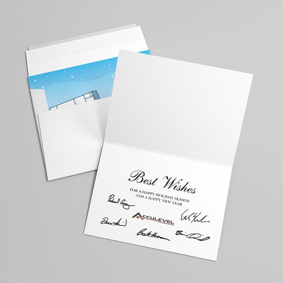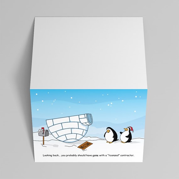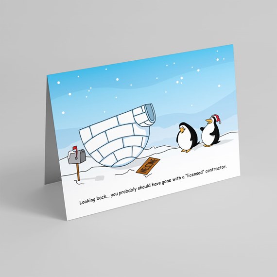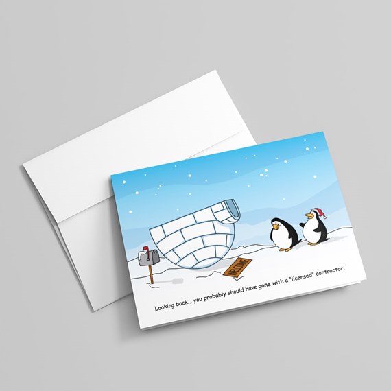 Two penguins discuss a new igloo home in this comical construction holiday card. This imaginative scene displays a great sense of humor and will send your holiday wishes to all on your list.