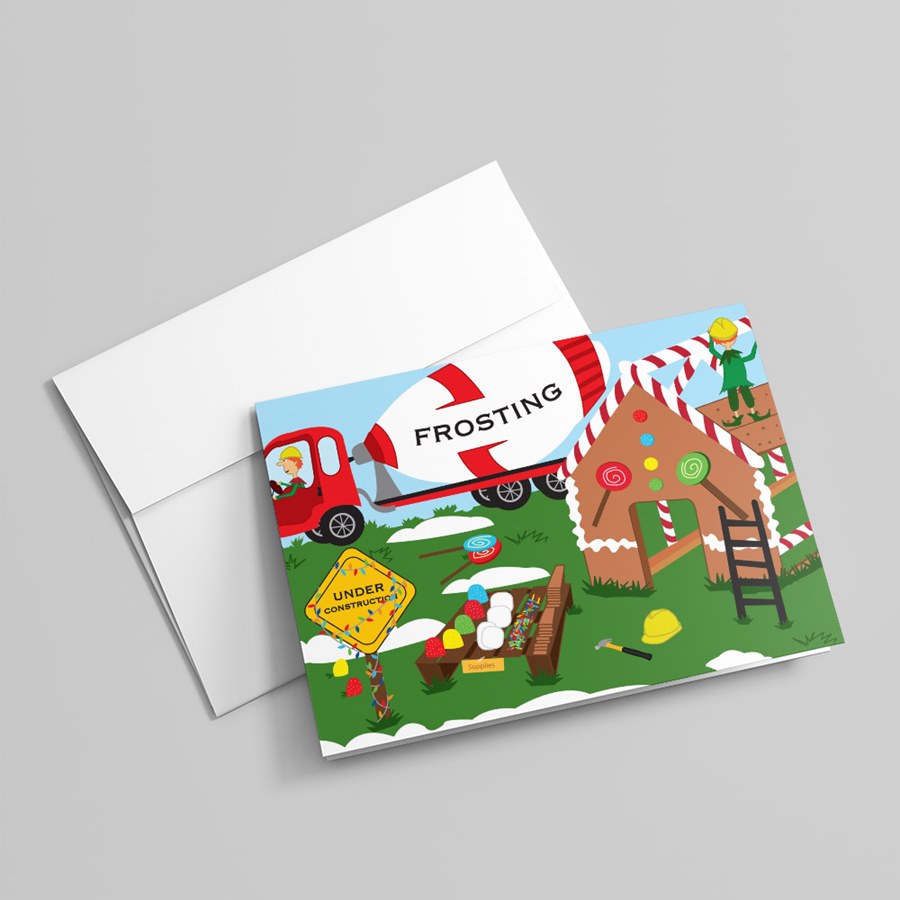These industrious elves will be working overtime with the construction of this massive gingerbread house. A Christmas decorating tradition becomes life-size on this construction holiday card.