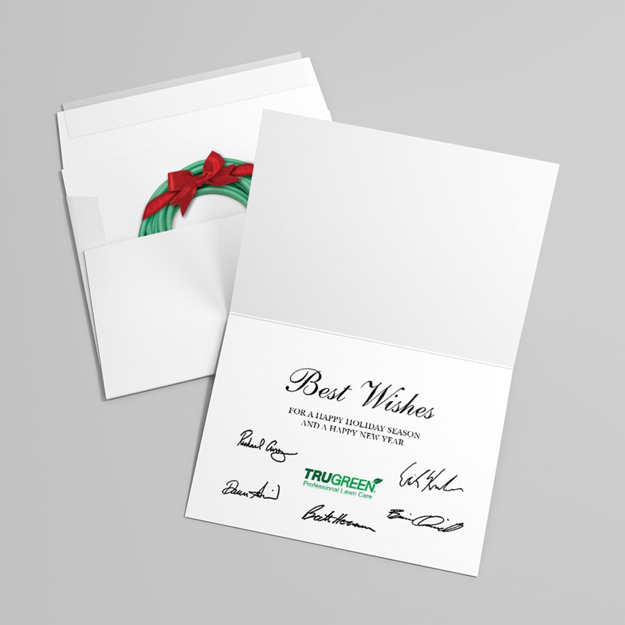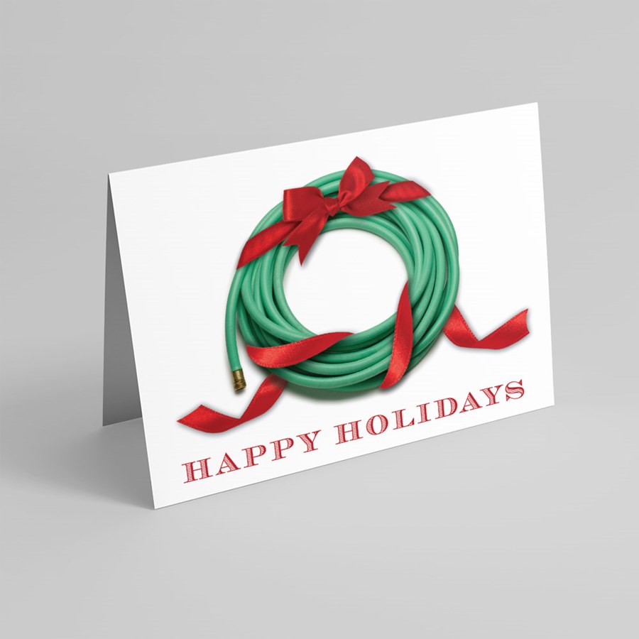 This holiday card features an unusual, garden-hose holiday wreath wrapped in red satin ribbon. Happy holiday wishes will be boldly proclaimed to all your customers and friends.