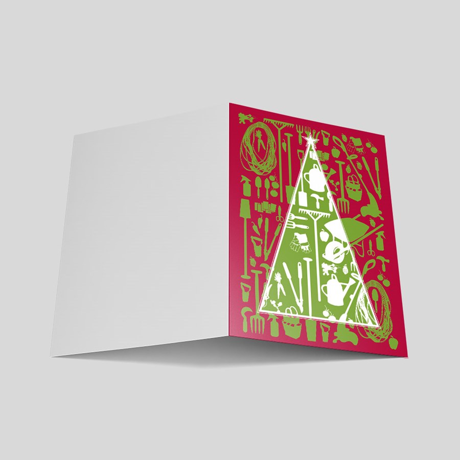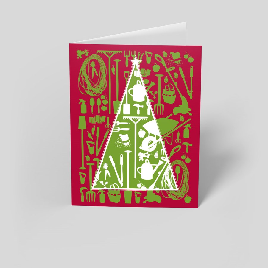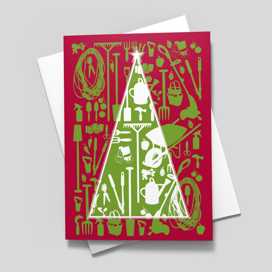 It's never too early to think about Spring planting! A delightful combination of landscape and garden tools creates the perfect backdrop for a seasonal landscaping Christmas card.