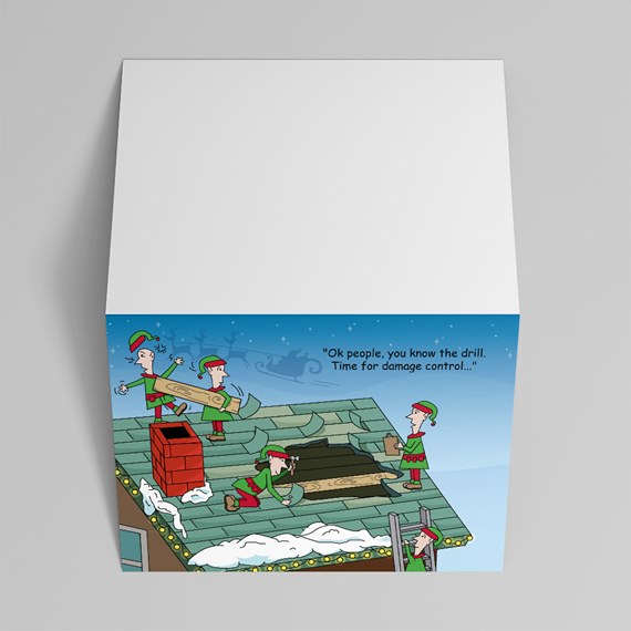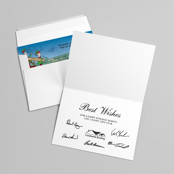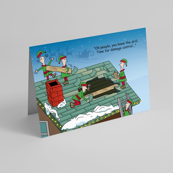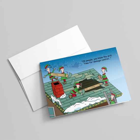 Santa's landings can't always go smoothly! His elves get busy and quickly repair the roof, leaving it in tip-top condition. This roofing holiday card has a great message and will represent your business perfectly.
