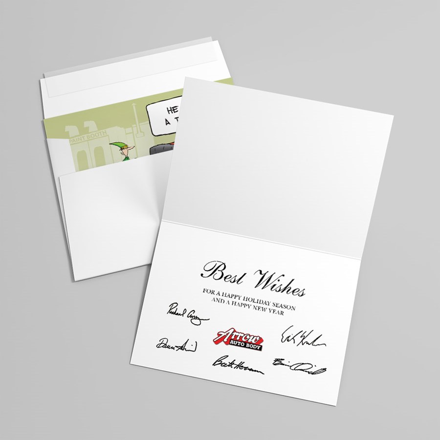 Santa's elves are on the job to repair the sleigh after an accident. This humorous auto body Christmas card will bring smiles to everyone on your list!