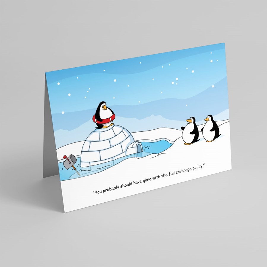 Full coverage would have cost more, but in the case of this poor penguin, it would have been worthwhile! Send some holiday cheer with these comical insurance Christmas cards.