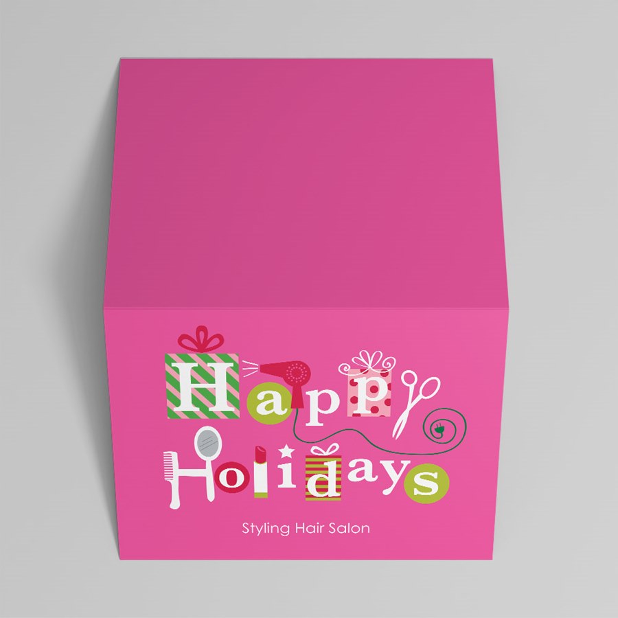 For a professional greeting that is a cut above the rest, choose this pretty in pink holiday design styled with icons of the salon industry. Your business name appears below the colorful greeting on this white, folding holiday card.