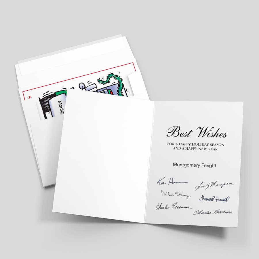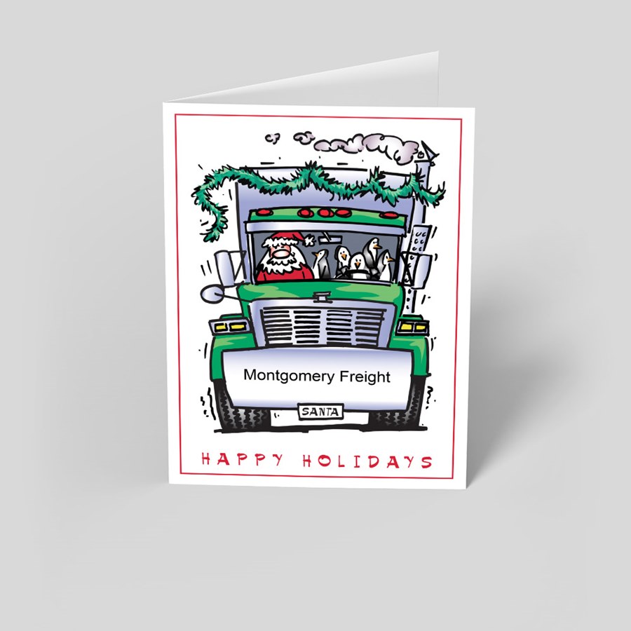 Santa's found a new way to deliver holiday cheer! The colorful illustration of a festive truck driven by penguins makes this card a fun way to send greetings. Your personalization is printed in red on the truck's bumper on the front of the white, folding card.