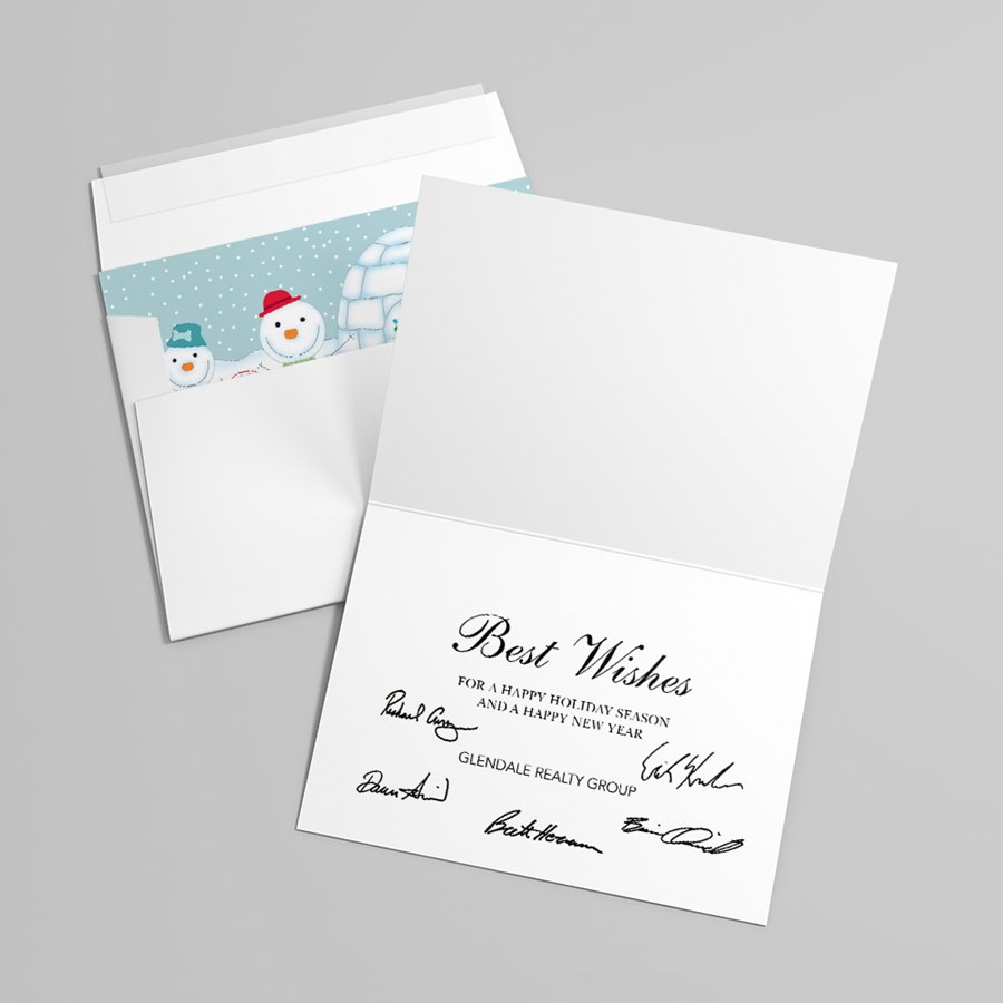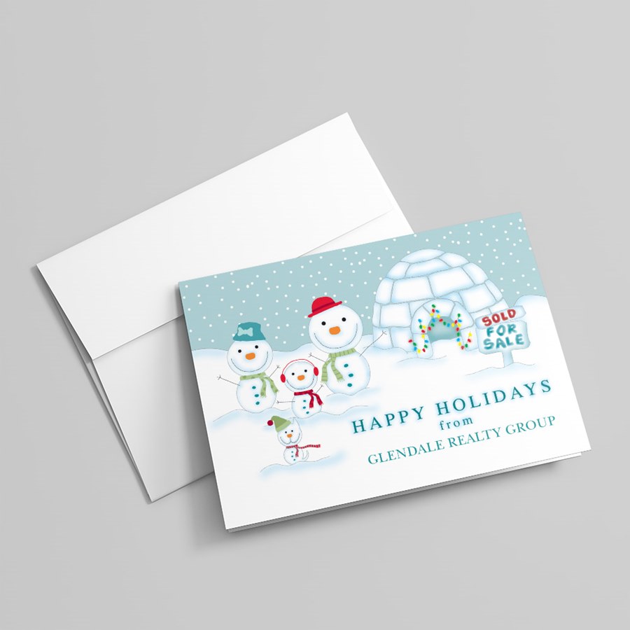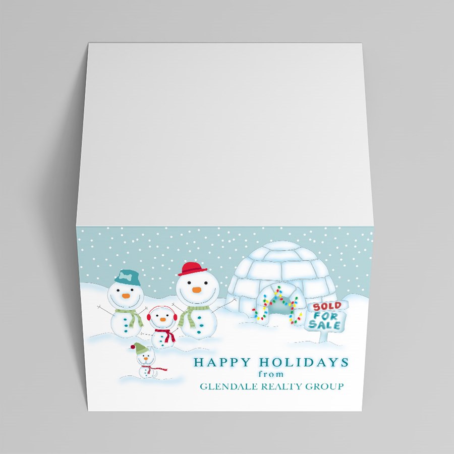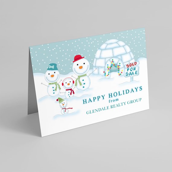 Send your real estate customers a smile this holiday season with this light-hearted, folding greeting card. An adorable illustration on the front depicts a family of snowmen posing in front of their new igloo.
