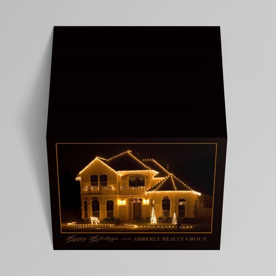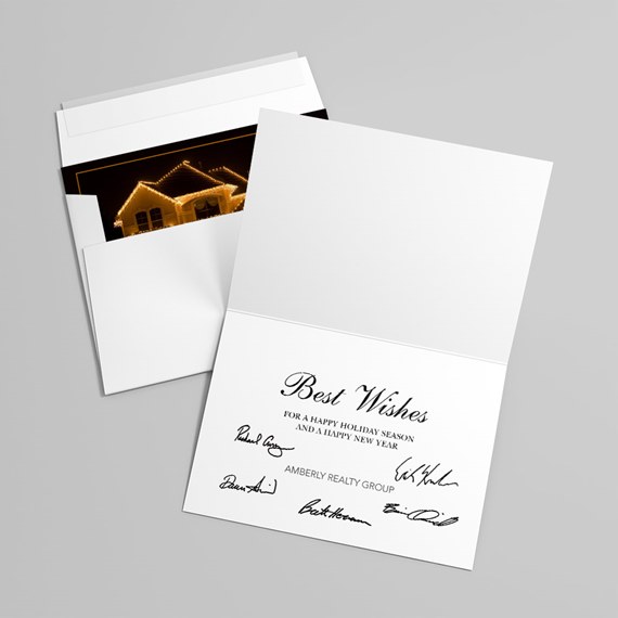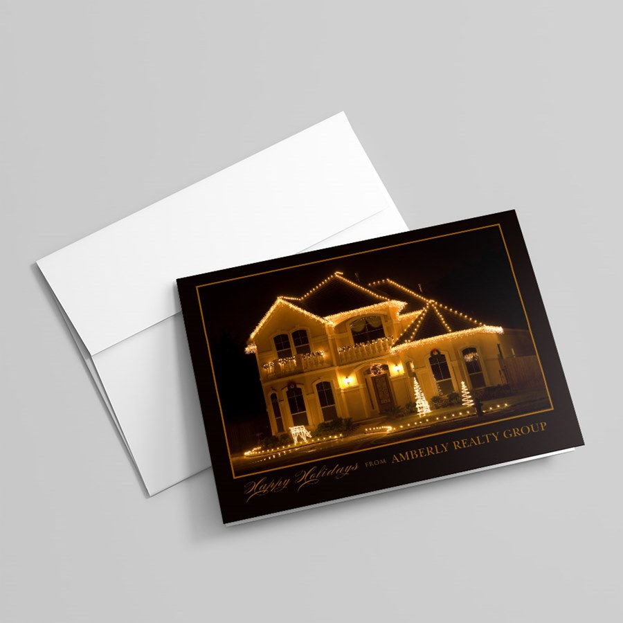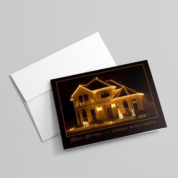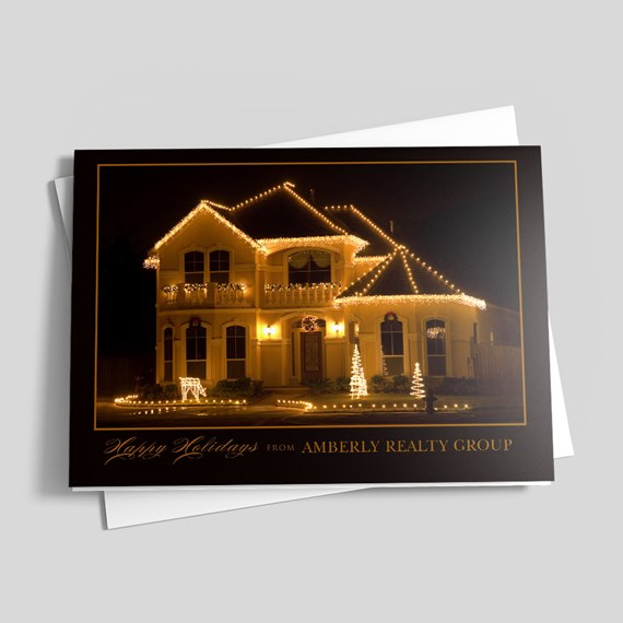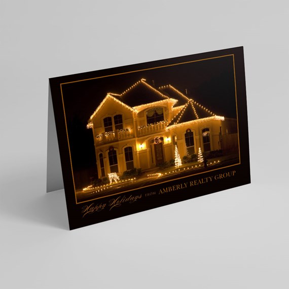A beautiful home is brightly lit against a black background on this white, folding greeting card. Your holiday message is printed below for the finishing touch to this memorable greeting.