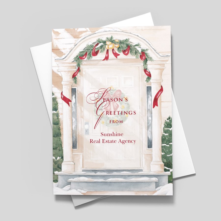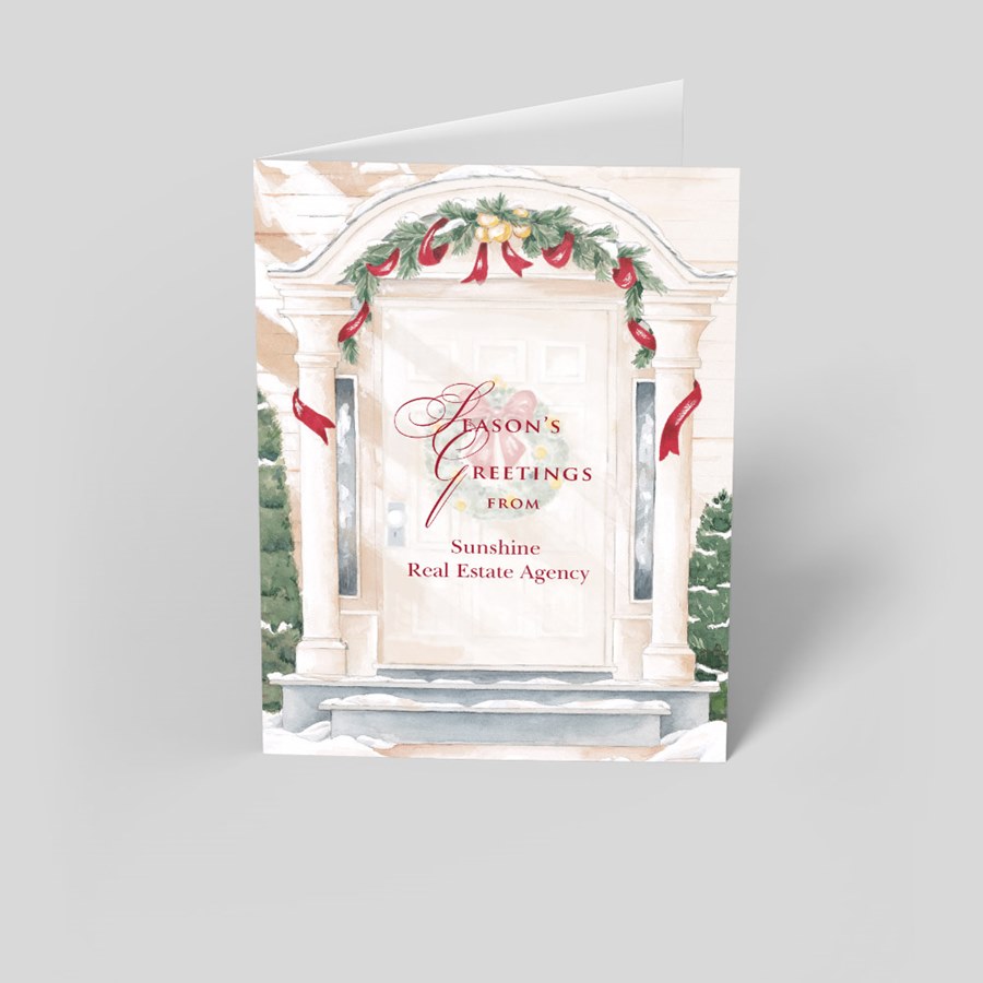 This thoughtful holiday card with a festive front door design is the next best thing to a personal visit. Your customers and associates will appreciate the gesture and genuine holiday sentiments printed on the white, folding card.