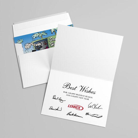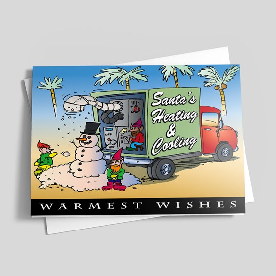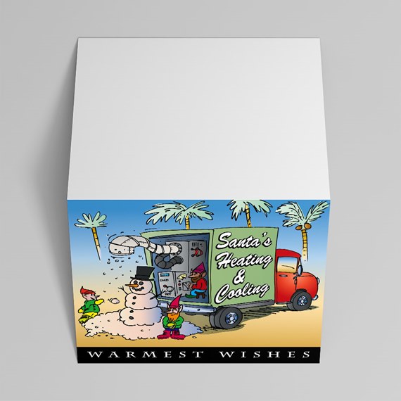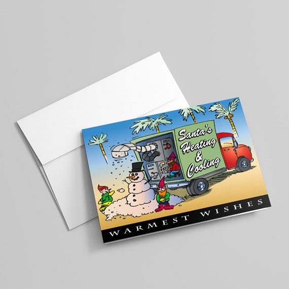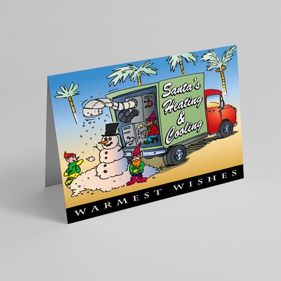 Keeping a snowman frosty in a warm tropical location can be a difficult task even for the heating and cooling business! This humorous holiday card featuring a melting snowman being rescued is fun way to spread holiday cheer from your business. Personalize the inside with a choice of verse and your company logo or even photo.