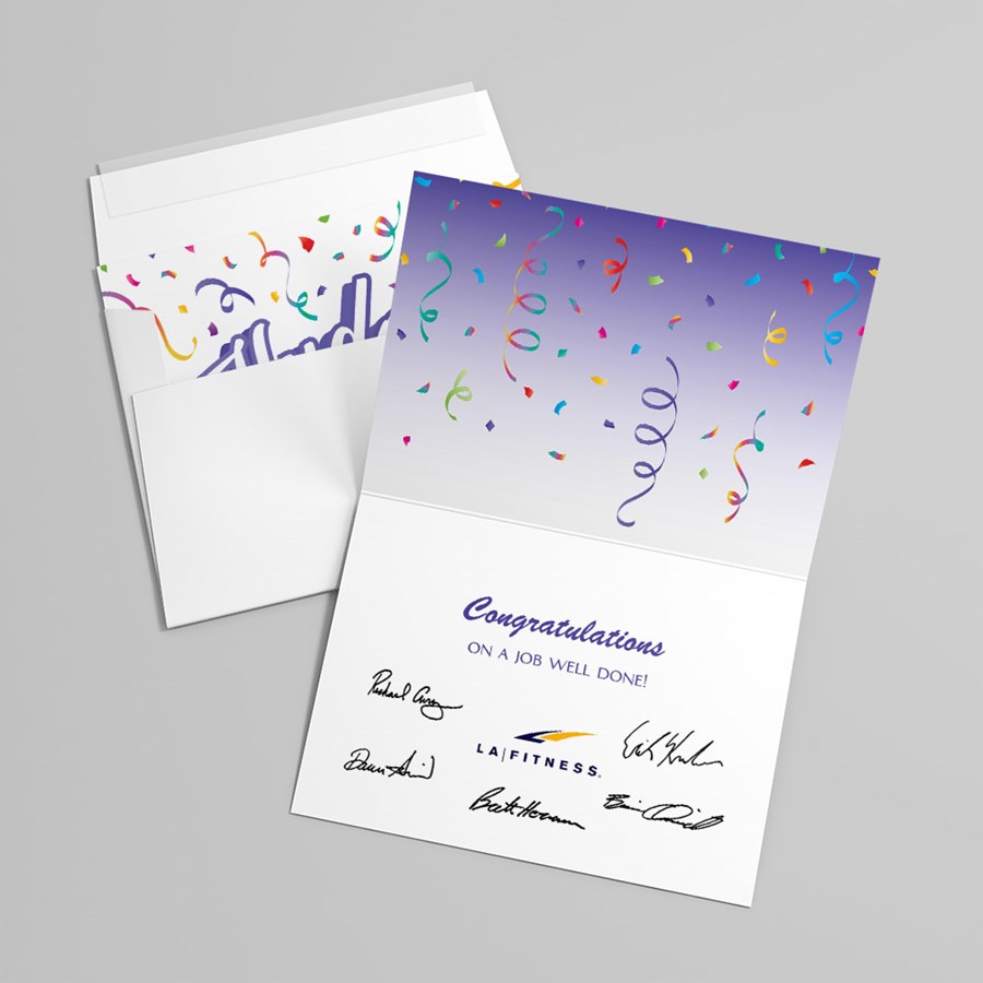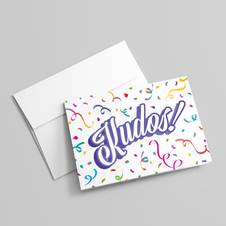 This custom congratulations card features colorful confetti on a white background around the word 'Kudos!' in a stylish purple-blue and white bubble script. The card's top interior fold includes a purple-blue and white gradient with more colorful confetti, and the back of the card is white. Choose from different paper types, sizes, and envelopes, then add your personalization. Want to have your cards mailed to your recipients for you? Select 'Addressing + US Stamp + Mail' at checkout.